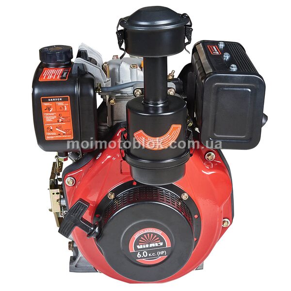 Дизельный двигатель Vitals DE 6.0s — 4-тактный одноцилиндровый мотор мощностью 6 л.с. с рабочим объёмом 296 см³. Оснащён системой принудительного воздушного охлаждения и ручным стартером. Расход топлива составляет 276 г/кВт·ч, объём топливного бака — 3,5 л, масла в картере — 1,1 л. Вал со шлицевым соединением диаметром 25 мм и длиной 30 мм, 6 шлицов (22×5 мм). Воздушный фильтр с масляной ванной защищает двигатель от загрязнений. Габариты в упаковке — 480×460×505 мм, масса нетто — 32 кг (брутто — 34 кг). Подходит для мотоблоков и сельхозтехники.