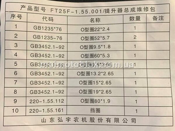 Кольца уплотнительные гидравлического подъемника TTG на минитрактор Foton 240/244, к-т: 11шт., тип 2