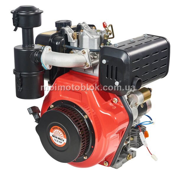 Дизельний двигун Vitals DM 12.0kne — потужний 4-тактний одноциліндровий мотор на 12 к.с. з робочим об’ємом 477 см³. Оснащений примусовим повітряним охолодженням та системою запуску ручний/електростартер. Витрата палива складає 275 г/кВт·год, що забезпечує економічність роботи. Має бак об’ємом 5,5 л та картер для 1,65 л масла. Вал зі шпоночним з’єднанням діаметром 25,4 мм і довжиною 72,2 мм з виїмкою 61,9×6,3 мм. Повітряний фільтр з масляною ванною продовжує ресурс двигуна. Габарити упаковки — 600×480×540 мм, вага — 51 кг (брутто — 53 кг). Ідеальний вибір для мотоблоків та сільгосптехніки.